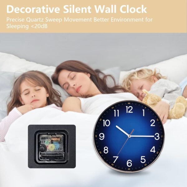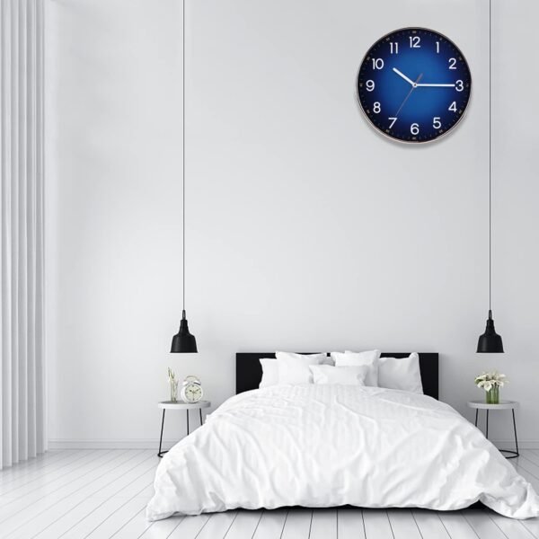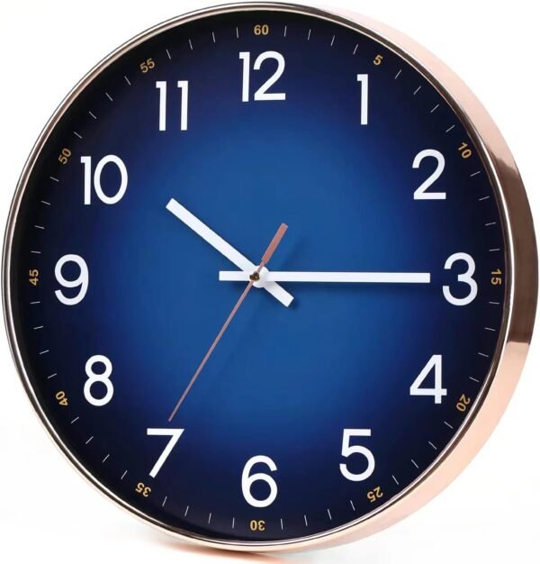 Round,Modern Rose gold electroplated frame with the gradient navy blue face,rose gold second hand echoes the case,quiet and elegant,dresses up any room.Back slot design offers easy installation.